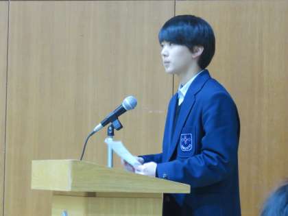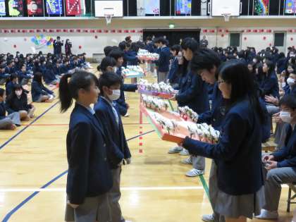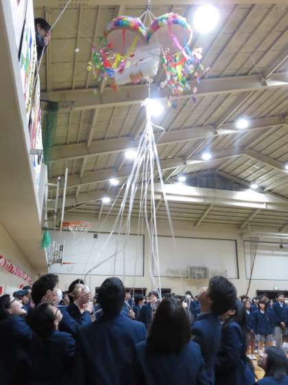 生徒会長増井君のあいさつの後,くす玉割りとコサージュの贈呈です。
