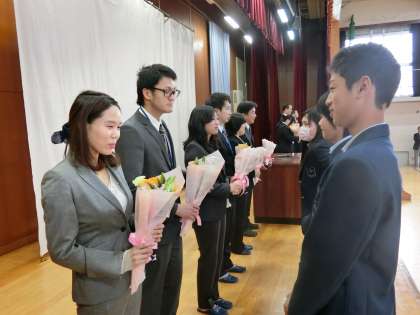 生徒会副会長の水引君の歓迎の言葉に続き、花束の贈呈がありました。
