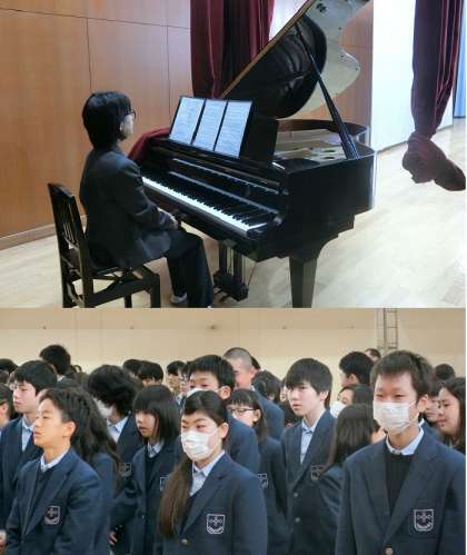 先ずは校歌の斉唱です。平田先生のピアノに合わせて元気よく歌います。