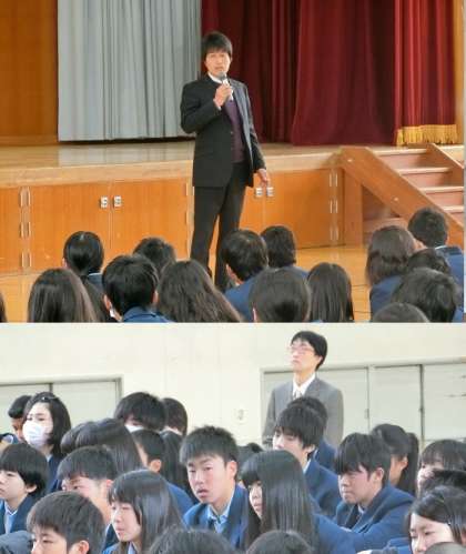 学校長よりあいさつと新学期に当たっての話があり、生徒会長の増井君から全校生徒へのアピール、最後に深見先生から生活についての話がありました。