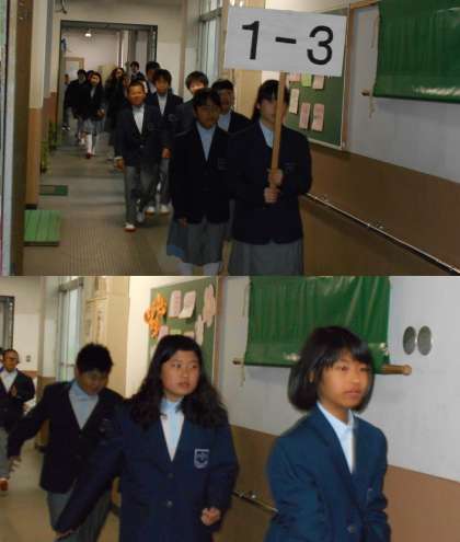 自分の教室に入り、説明を受けた後、並んで体育館に向かいます。