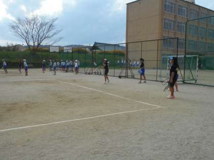 女子ソフトテニス部の活動です。手前のコートでは試合が近い3年生がラリーの練習のようです。
