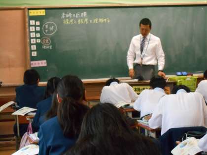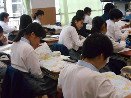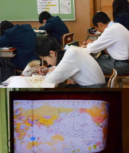 社会科は岸本先生です。地理の分野でいきなり難しい場面、地図のたてよこを見ながら緯線と経線の学習です。
