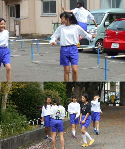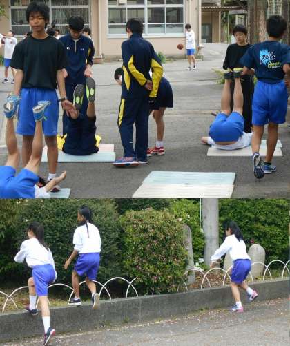 陸上部は前半は中庭練習です。いろいろ工夫してトレーニングに励んでいます。
