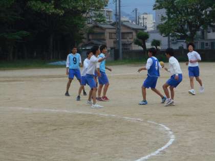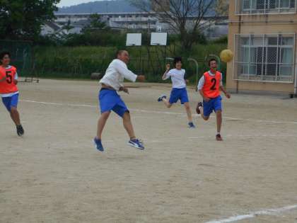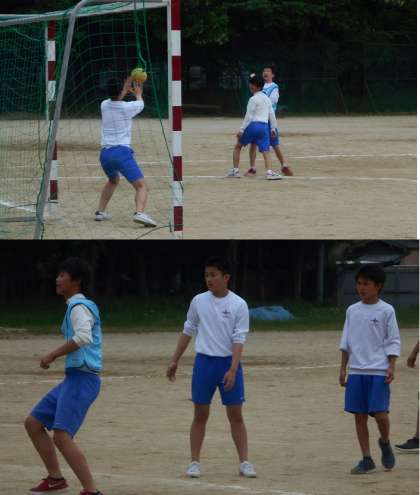 男子はグラウンドでハンドボールの授業です。ジャンプしながらのシュートも様になってきています。