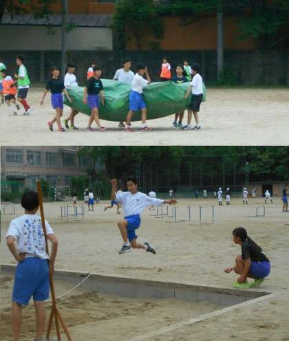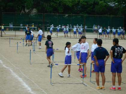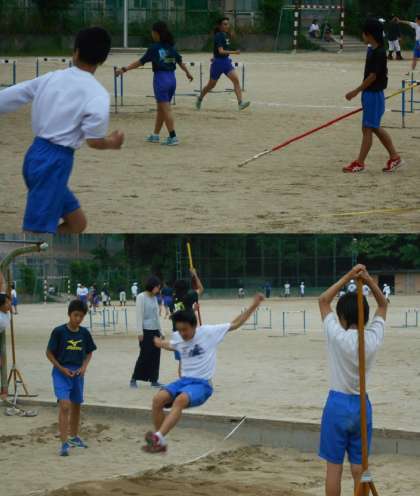 ハードルを使ったトレーニングとマットで高跳び,砂場で幅跳びと跳躍の練習もしています。