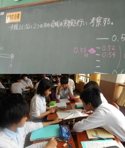 力の合成をグループごとに実験で確かめています。