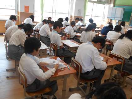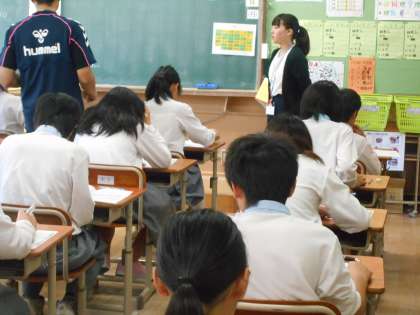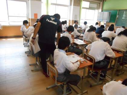 1年4組のようすです。ちょうど社会科の岸本先生が回っておられるところです。
