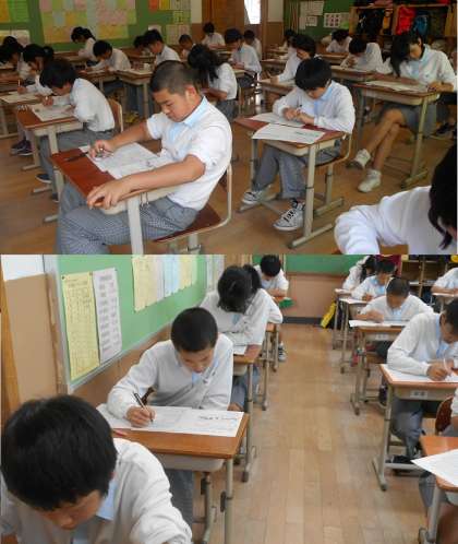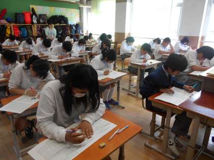 1年4組の初めての英語のテストです。テストの最初は「リスニング」があります。