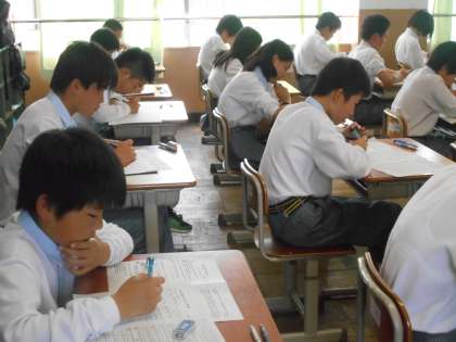 1年1組の英語です。生徒たちの取組の様子を見ていると,多くの生徒がしっかり聞けているようです。解答の仕方にも工夫があって,折角聞き取れたのに書けない・・・ということは少なくなったように感じます。