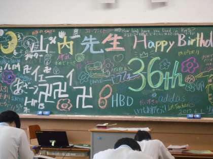 3年6組のようすです。今日は担任の先生の誕生日みたいな・・・生徒たちがおめでとうを黒板に書いてくれたようですね。