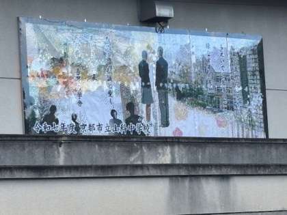 その絵をパネルに固定し、先日より体育館壁面に展示しています。この絵には校歌も書き込まれており、本校の校門を通る際、皆さんが懐かしく鑑賞いただけるよう考えました。来る令和9年度は山科中創立80周年を迎える予定です。校歌が3番まで揃う時に山科中は80歳を迎えることとなります。