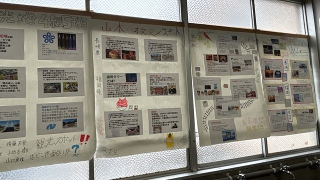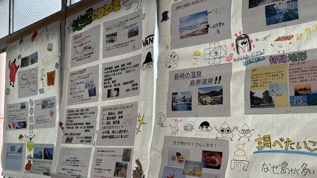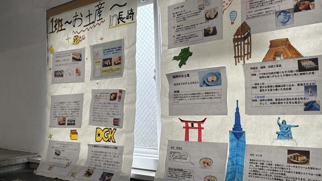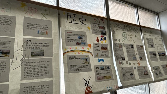 長崎の歴史については全学級で学び合い、長崎が誇る文化や食文化、外交等について生徒たちは興味深く調べていたようです。併せて、学年内で展示している成果物を公開し、後日投票により何点かを学年代表として発表へつなげるとのことでした。