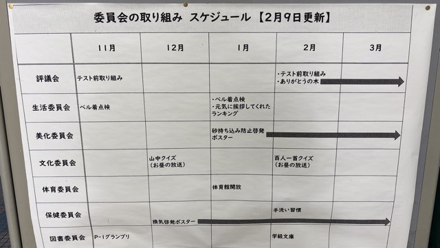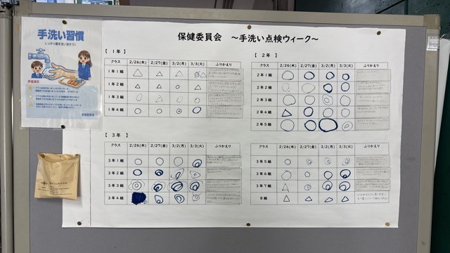 今回、保健委員会では「手洗い点検ウィーク」と題し、風邪対策でもある手洗いの啓発を行ってくれました。その影響もあり、現時点でインフルエンザによる欠席生徒も少なく、順調に学校生活が進んでいます。特に卒業式を控えた3年生にとっては残り少ない中学校生活一日一日を大切にするためにも「体調維持・保持」に努めてほしいと願っています。