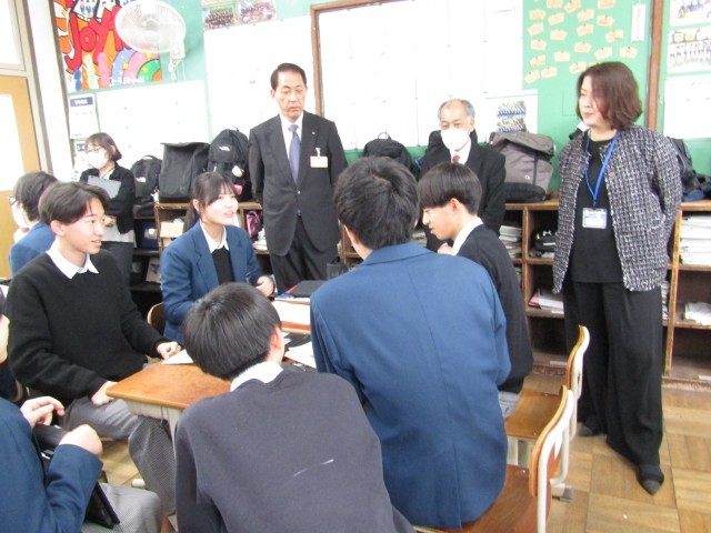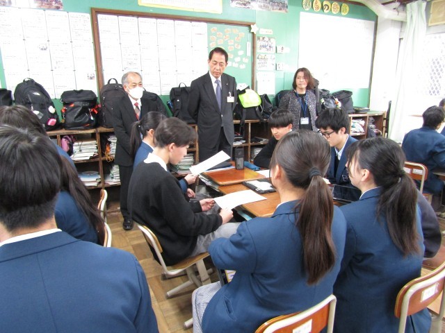 3月2日(月)午前中には、その取り組みの一端を参観するため、ご多忙の中、稲田 京都市教育長様をはじめ京都市教育委員会初等・中等の首席指導主事様に来校いただきました。山階南小の授業を参観された後、山科中を訪問され、3年4組の英語科授業を最初から最後まで参観いただきました。授業では英語を駆使したディベートに参加する生徒一人ひとりの見取りをしていただきました。
