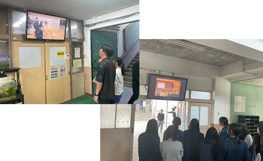 山科中学校では、各棟に大型モニターを設置し、日々、子どもたちの学校生活のようすを紹介しています。人だかりの先には、部活動紹介のようすが映し出されていました。