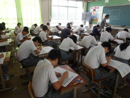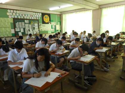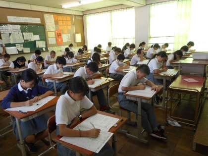 今日は1年は理科・社会・国語、2年は国語・社会・理科、3年は理科・国語・社会の順にテストを受けました。みんな、真剣に取り組んでいます。
