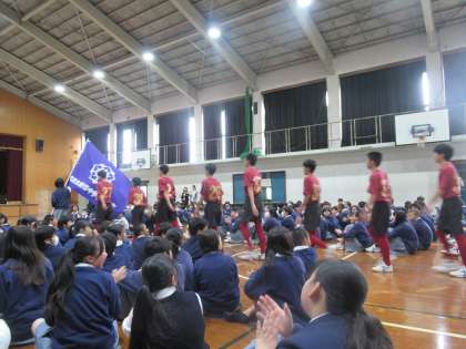 勝負服に身を包み、まずモチベーションムービーで各部活動の頑張りを共有しました。教室では見せない顔がたくさんみられ、時に歓声が起きていました。その後、各部活からの堂々とした決意表明を聞き、校長先生からの激励をいただきました。