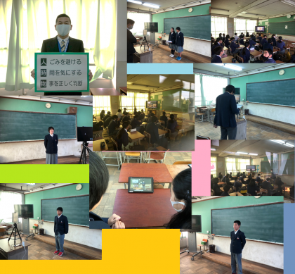 生徒会担当の先生もZoomの使用にも慣れてきて,離れた各学級がつながり,思いを共にしながら,頑張った自分を称え,改めて新年がんばろう,そんな思いを交わしたたいへんいい終業式,全校集会だったんではないでしょうか。