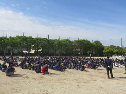 教頭先生の司会のもと,整然と整列した生徒たち。どの生徒の目も活き活きと輝いている。