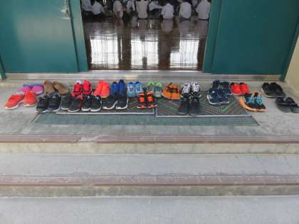生徒の活動の様子を見るために,校内を巡回しているといろいろなものが目に入ってくる。まずは,体育館での身体計測に行ってみて目に入ったのが,入口に整然と並べられた運動靴。教師の指示なのか生徒の自発性の賜物なのかわからないが,気持ちがいい。この運動靴を見ているだけで,爽やかな気分にさせてくれる。