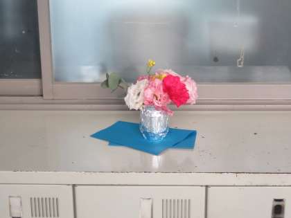 しばらくして,校長室に戻ってみると部屋の前の靴棚の上に,可憐な花が手作りの花瓶と共に置いてある。確か,先ほどまではなかったはず。「ああ,そうか」と合点がいく。「そういえば,昨日の入学式の式花を1組の生徒が教室でいけ替えていたな」と。その一つを,校長室の前に置いてくれたのだと。そう思って廊下を見渡すと,いたるところに花が置かれてあった。ほっと安らぐ。