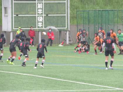 春季総合体育大会の先陣を切って,ラグビーの予選リーグが17日(土)10:00より吉祥院運動公園で始まりました。あいにくの雨でグランドコンディションは悪いですが,勧修中ラグビー部(黒のジャージ)の登場です。相手は修学院中学校。試合前最後のタックル練習,そしてキックオフ。