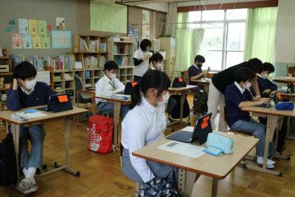個人のタブレット端末を使い、総合の時間に実際にタブレットを使って遠隔で授業を受けたりするための取り組みが行われました。