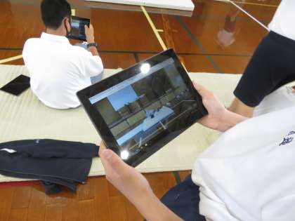 昨日のHPでも紹介されていましたが,体育のマット運動の授業でGIGA端末の活用がされています。ロイロノートの動画機能を使って,各自のマット運動を録画し,一番うまくできたと思われる動画を指導者(教師)に送り,評価してもらうというものです。写真の左端が動画を撮っているところです。真ん中の写真が撮った動画を生徒がチェックしているところ。右端が最終的に送る動画を決定し,送信作業をしているとことろです。