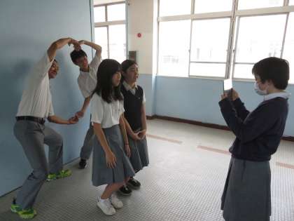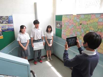 過日,HPの「GIGAスクール構想その12」で,3年生が9月に実施予定の修学旅行にGIGA端末を持参し,班の企画書に基づき修学旅行の様子を動画撮影し,旅行から学校に戻ってきたのち,編集を行いGIGA端末を活用して発表を行うことを掲載しましたが,本日,その動画のオープニングが校内でGIGA端末を活用して撮影されました。