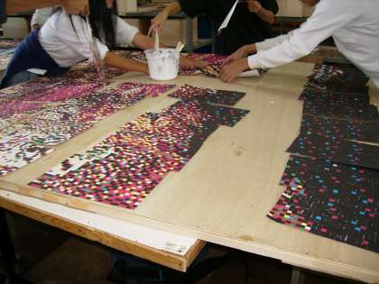 9月27日、各クラスの個人個人がこつこつ完成させたモザイク画のピースが一枚の板にかざりつけられ始めました。展示委員さんたちは手を接着剤だらけにしながら、作品をつくっていきます。