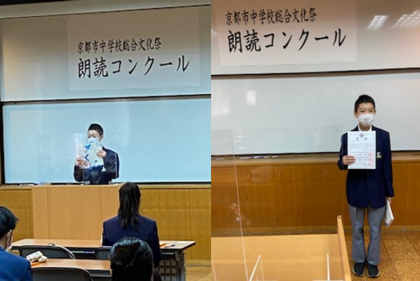 11月6日(土)13:00より京都市総合教育センターにて,令和3年度京都市中学校総合文化祭第33回京都市中学校朗読コンクールが行われ,本校からも1名参加しました。朗読順が,1番手という大変緊張するなか「星の花が降るころに」の一節を,相手に朗読だけで伝えるという,難しいことに挑戦してくれました。残念ながら,優秀賞等からは漏れましたが,よく頑張ってくれました。