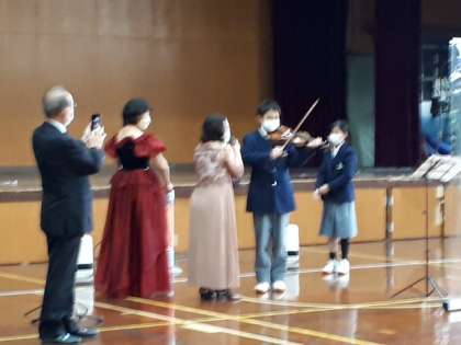 では、3名の生徒がヴァイオリン演奏体験をさせていただきました。貴重な体験です。