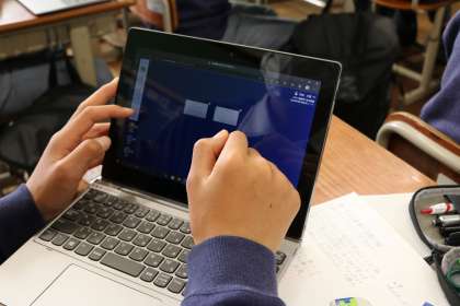 3年のあるクラスを覗くと、数学の時間にタブレットを使って授業をしていました。