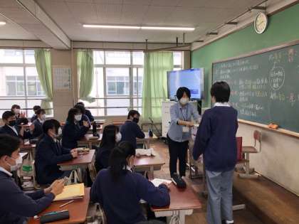 感染対策のため本部役員と3年生の代表生徒が図書室に集まり,各クラスにオンライン配信にて実施しました。