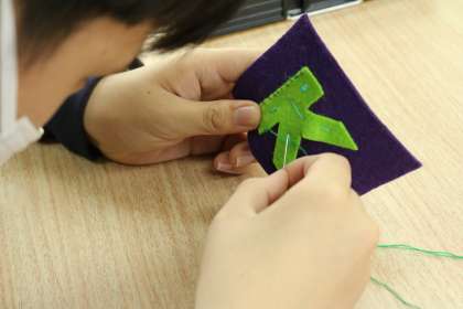 イニシャルのフエルトを布に手縫いでつける作業をしている最中で、みんな必死に針を動かしていました。