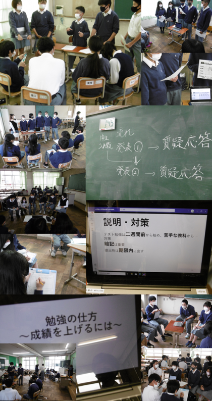 小学校のテストとは異なり,初めての定期考査を受ける1年生に対し,先輩の2年生から「しっかり備えて、万全の状態でテストに臨む」方法について「発表・教える・質問に答える」という1・2年合同総合的な学習の時間(キャリア教育)が実施されました。
