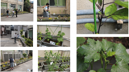 朝から,校門付近のお花や植木,農作物に水まきをしてくれている1組さん。