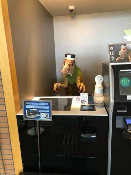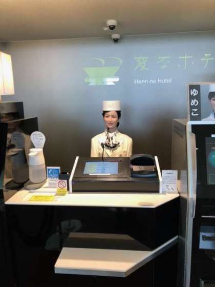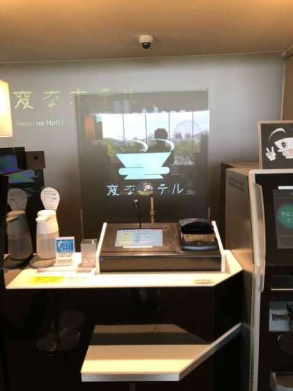 宿泊する「変なホテル」の受付の方々です。