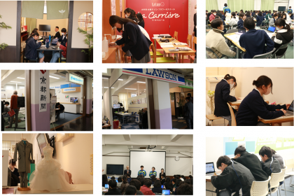 各企業ブースで就活の準備段階で行う自己分析と企業研究に取り組み,自身と企業の愛称を分析するという体験です