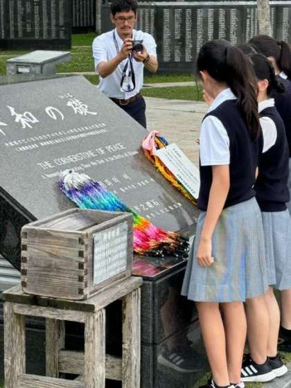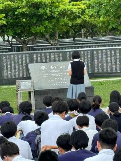 この慰霊碑の前で、これからの平和を願い、平和宣言、折り鶴奉納、折り鶴の歌の合唱など、平和セレモニーを行いました。