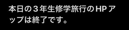 ※予定では明日の学校到着予定時刻は19時00分となっておりますが、遅れそうな場合にはHPにアップしてお知らせします。お迎えに来られる保護者の皆様、ご自宅出発前にHPをご確認ください!