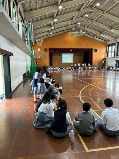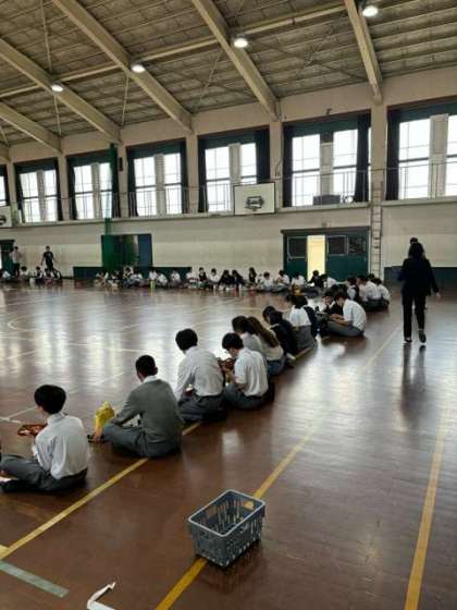 新しい体育館に喜びの声を上げるだけでなく、これまで勧修中の生徒のために貢献してきてくれた体育館と思い出を残したい、そんな声から今日2年生では「学年全員で体育館学年ランチ」を実施しました。