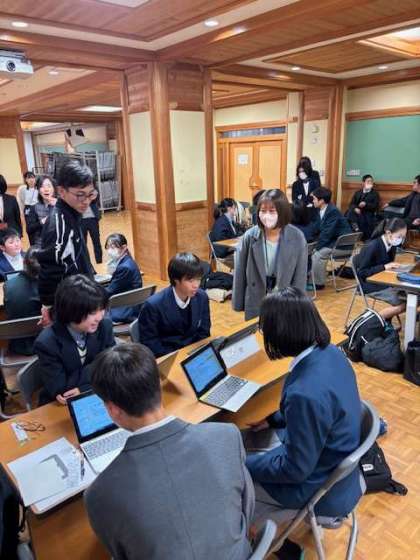 「山醍の生徒会本部役員間の交流を深め、自校の活動活性化を図る」「自校が取り組んできたことの報告を行い、山科醍醐支部の生徒の連帯感を高める」を目的に、本日12月24日 (火)、花山中学校で生徒会交流会が行われています。