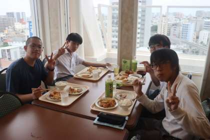 ホテルで夕食中です。会場の都合で前半ば男子、後半は女子が食事を摂ります。しっかり食べて、この後のレクリェーションや明日の活動に備えましょう