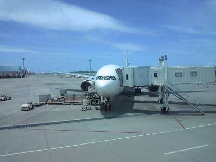 「定刻どおり、11時半前に那覇空港に到着しました。心配されていた天気は雲はあるものの晴れ。飛行機をでた瞬間に蒸し暑さを感じる気温でした。今からバスに乗り美ら海水族館へ向かいます。」