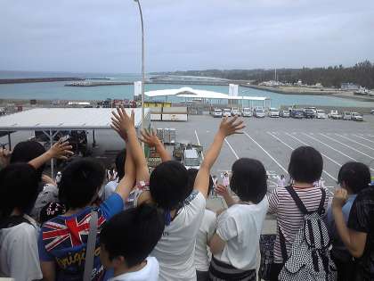 「いま、伊江港を出発しました。港から民家の人に見送られながら、手をふって涙のお別れとなりました。『いってらっしゃい』という横断幕もかかげていただき、みんなにとって第ニのふるさとになったのではないでしょうか。」