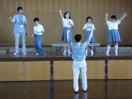 体育館へ行くと1組の人たちが,ハンドベルの練習をしていました。 教室の練習ではうまく演奏できていたのが,広い体育館ではあまりうまくいかなかったようです。担任の先生からは30点,次は60点と,なかなか厳しい点数がつけられていました。本番まであと少しです。