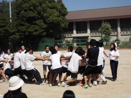 クラス対抗で棒引きの要領で綱を引き合う競技です。今日は,入退場と勝ったチーム,負けたチームの場所の入れ替わりなど練習をしました。トーナメント方式でおこないます。各クラス作戦を立てて,一本でも多くとれるように,がんばってください。