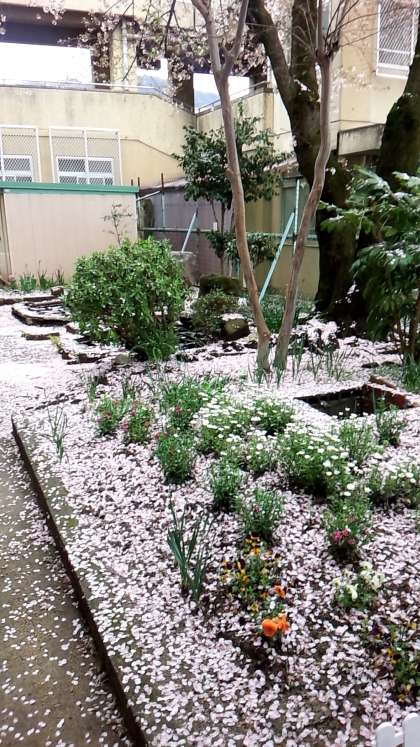 雪景色? と見間違う桜の花びら。校舎南の大きな桜の木が満開になっていましたが,雨の影響で散り始めてしまいました。でも池の周りを見ると一風変わった景色が。明日になれば風に飛ばされているかもしれませんが,勧修中の桜の木はまだまだ花が咲き続けています。学級写真までは大丈夫かな。